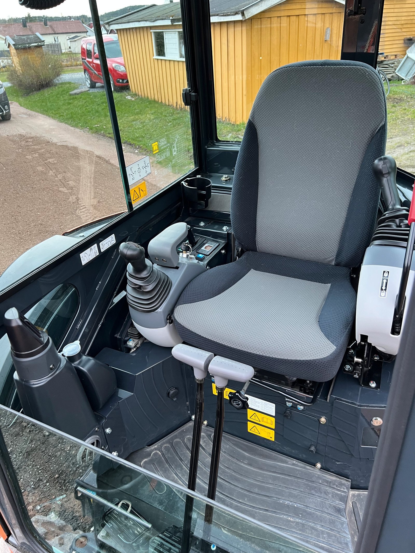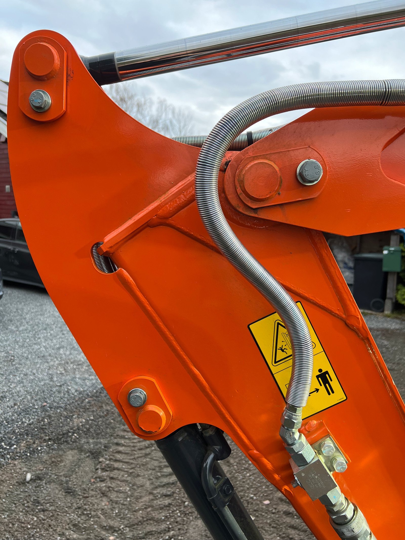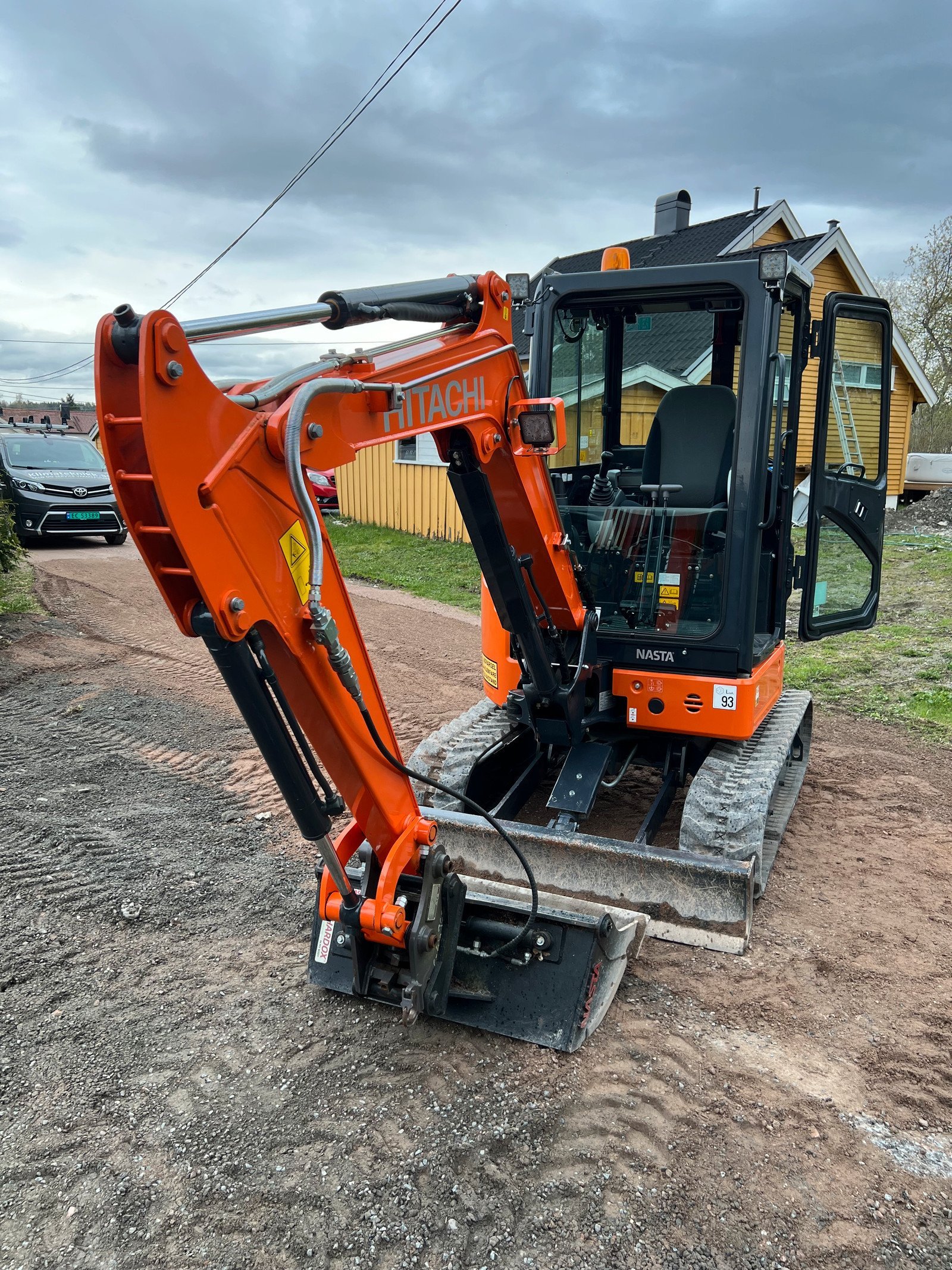 Hitachi presque inutilisée et relativement propre. Godet de fouille, godet de ponçage inclinable, fourche à palette et griffe à bois.